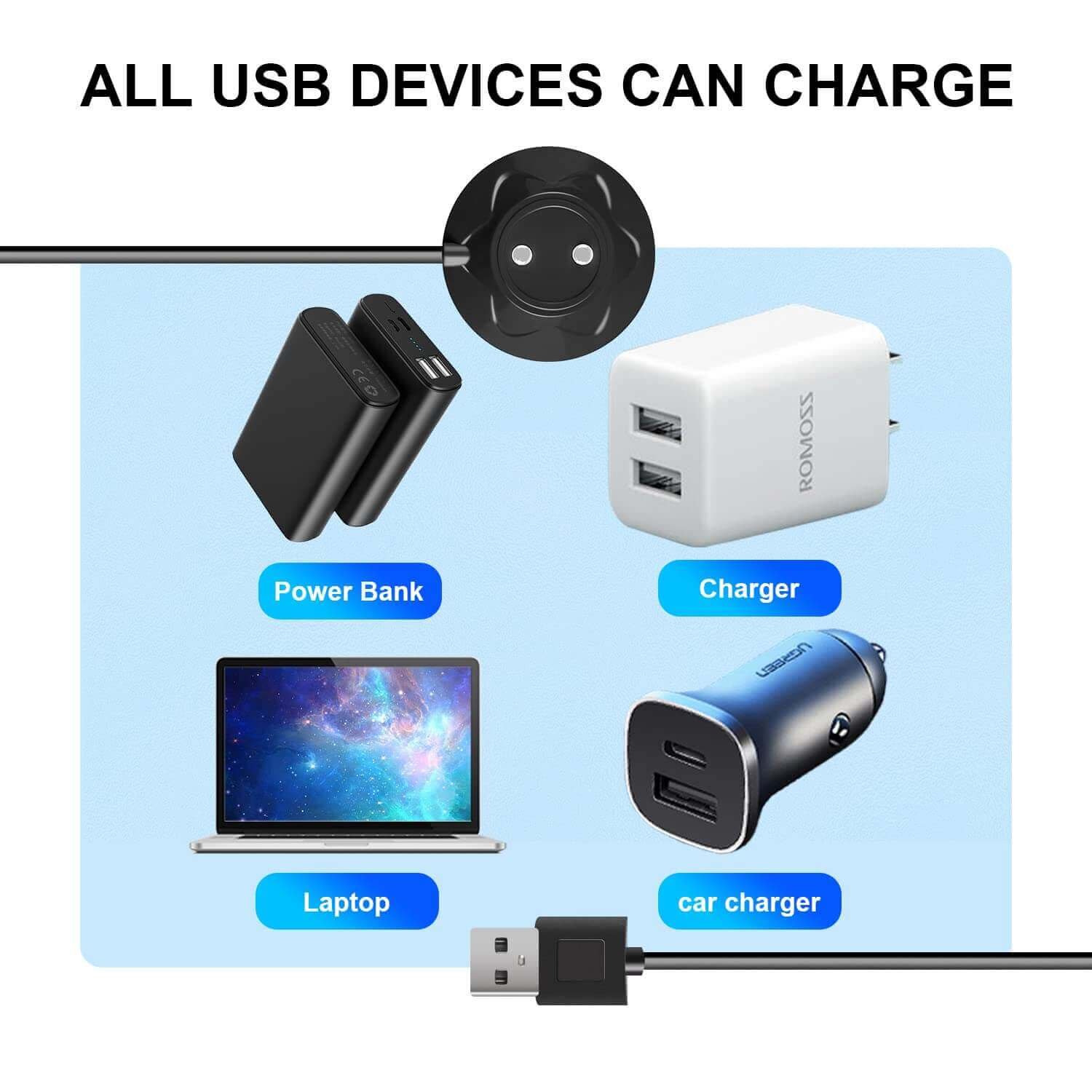 USB port design fits power banks, wall chargers, laptops, car chargers, computers, and other devices with a USB port, convenient for use anywhere.